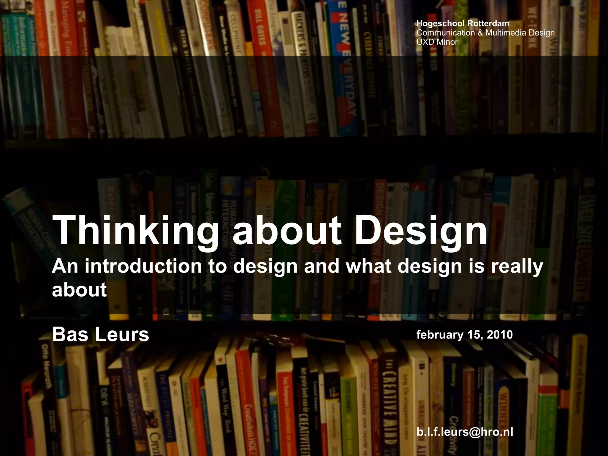 This document provides an introduction to design and what design is really about. It discusses the author's experience studying graphic and typographic design at the Royal Academy of Fine Arts in The Hague from 1992-1996. It also discusses perspectives on design education and contrasts romantic versus taxonomic views of the visual design discipline.