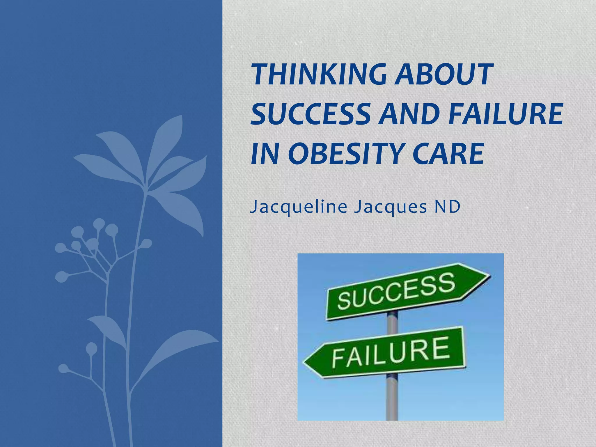 The document discusses the contrasting definitions of success and failure in obesity care between healthcare professionals and patients, highlighting how traditional metrics largely focus on weight loss rather than broader health outcomes. It emphasizes the need for alignment in understanding these definitions to improve treatment and patient satisfaction, while also advocating for a shift towards chronic management of obesity as a disease. Ultimately, it argues that success should encompass a variety of health and quality of life measures, rather than solely body weight targets.