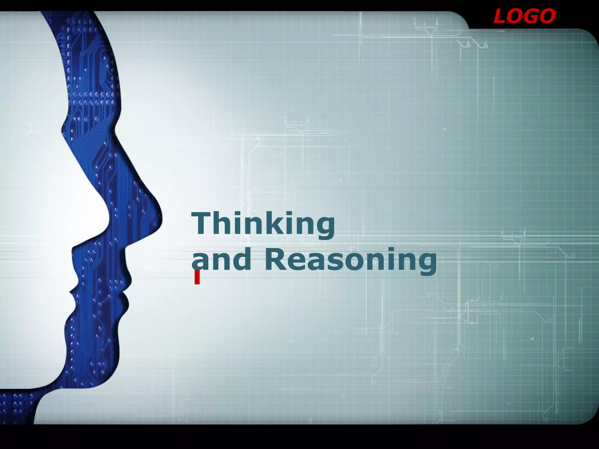 The document discusses different aspects of thinking and reasoning. It defines concepts as mental representations of categories that share common properties. It describes the hierarchy of concepts from superordinate to basic to subordinate levels. It also discusses heuristics like the representative and availability heuristics. There are different kinds of thinking such as directed, critical, creative, and associative thinking. Reasoning can be inductive, deductive, or analogical. Syllogisms are a form of deductive reasoning.