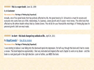 The document provides advice on how to think big and achieve success. It discusses using positive thinking to overcome failure, lack of confidence, and doubt. Believing in yourself is key - successful people believe in their abilities rather than relying on luck. The author advocates setting big goals, focusing on objectives, and developing others. Leaders listen to others, learn from mistakes, and focus on empowering people. Ordinary people can achieve greatness through determination.