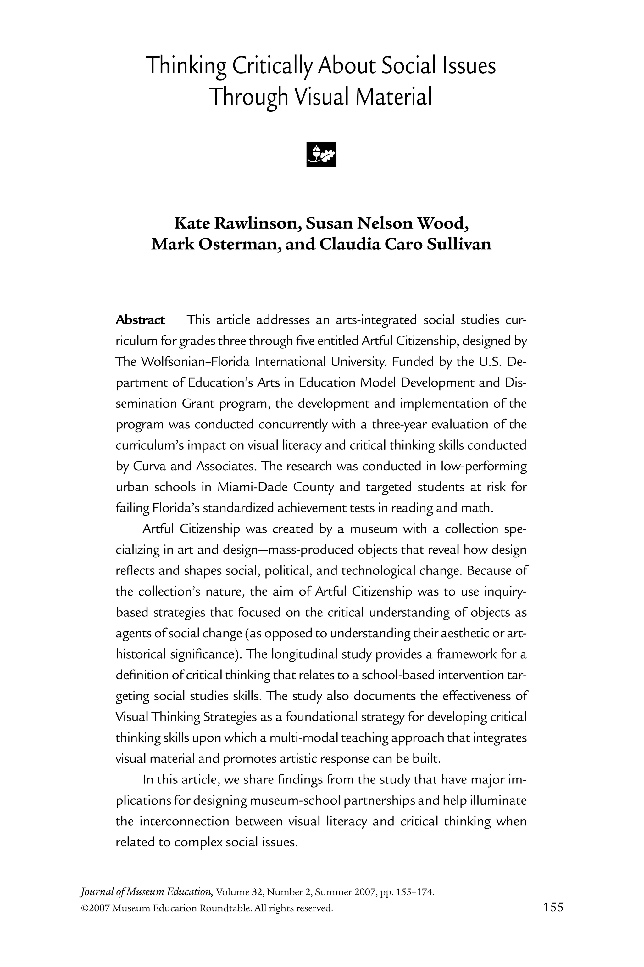 The article discusses the 'Artful Citizenship' curriculum designed for grades three to five, integrating visual materials into social studies to enhance critical thinking and visual literacy among at-risk students in urban Miami schools. Funded by the U.S. Department of Education, the program utilized inquiry-based strategies and visual thinking methodologies to create engaging learning experiences that aimed to empower students to become informed citizens. Findings from the three-year study highlighted the effectiveness of museum-school partnerships and the connection between visual literacy and understanding complex social issues.