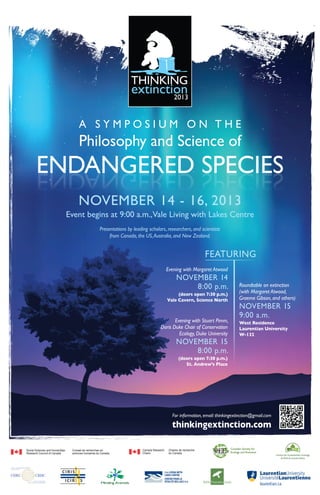 The document announces a three-day symposium from November 14-16, 2013 on endangered species. It will include presentations from scholars and scientists from Canada, the US, Australia and New Zealand. There will also be evening events featuring Margaret Atwood on November 14th, Stuart Pimm on November 15th, and a roundtable with Margaret Atwood and Graeme Gibson on extinction on November 15th.