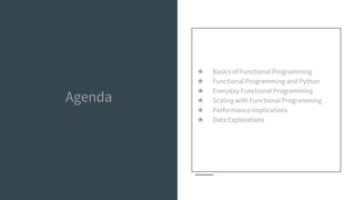 The document outlines a presentation on functional programming, including its basics, myths, and practical applications in Python. Key topics cover first-class functions, higher-order functions, performance implications, and the use of libraries like itertools and functools. The agenda advocates hands-on learning and provides Python code examples demonstrating various functional programming techniques.