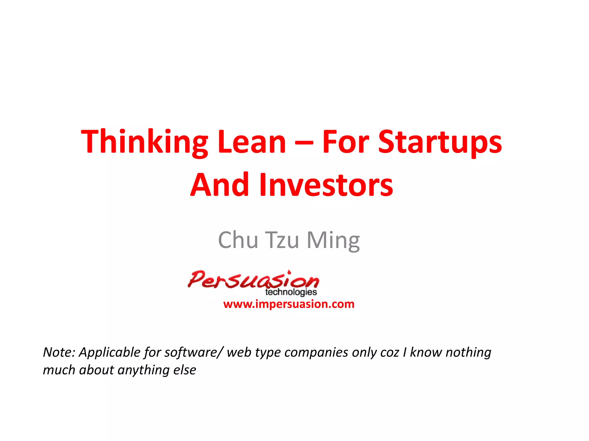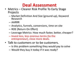 This document discusses the Lean Startup methodology for startups and investors. It outlines some common problems founders face such as not knowing their target customer or problem to solve. The Lean Startup approach advocates building a minimum viable product, getting customer feedback early through discovery and validation, and iterating quickly through a process of build-measure-learn. Key metrics for startups include acquisition, activation, retention, and revenue. Tools and techniques discussed include MVPs, analytics, A/B testing, and virality mechanics. The document argues the Lean Startup approach enables better risk assessment for investors in early stage companies.