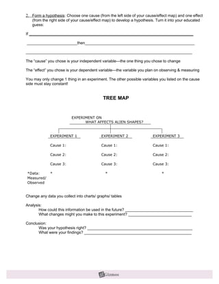 This document outlines the steps for conducting an experiment using thinking maps, including: framing a problem/question, researching background information, developing a hypothesis and cause/effect map, outlining an experimental procedure and variables, collecting and recording data, analyzing results, and drawing a conclusion. The example experiment tests how different variables affect alien shapes.
