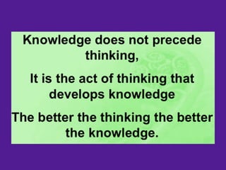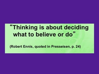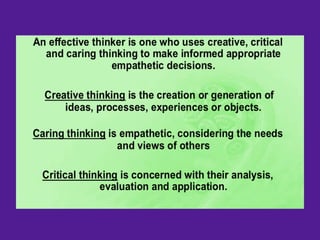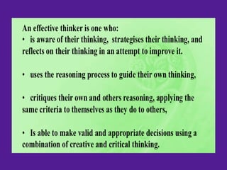 This document outlines an agenda for a workshop on thinking skills for 21st century learners. The workshop will explore the concepts of thinking and characteristics of effective thinkers. It will discuss how to develop thinking skills using thinking tools, cooperative learning structures, and rich learning tasks. The workshop will also provide context on how 21st century learning differs from and is similar to 20th century learning and discuss implications for developing thinking in educational contexts.