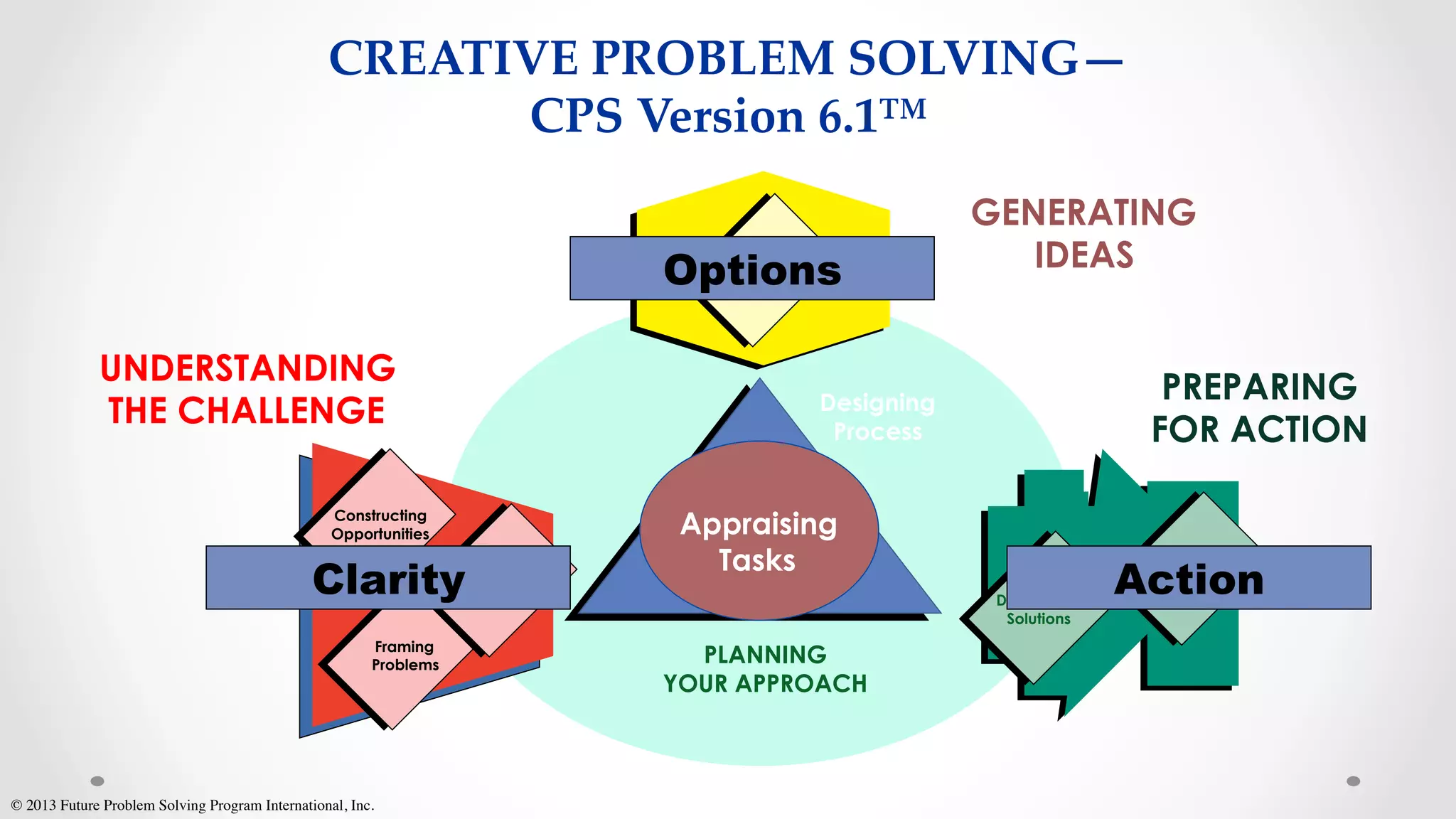This document provides guidance on creative problem solving tools and techniques. It discusses both divergent and convergent thinking approaches. The divergent section includes guidelines for generating many novel ideas using techniques like brainstorming, brainwriting, and SCAMPER. The convergent section discusses focusing on the best ideas and provides guidelines for affirmative judgment. The document then provides examples of applying specific tools like attribute listing, morphological matrices, and hits and hot spots to structure problem solving.