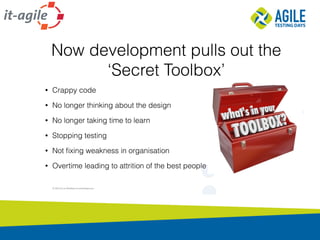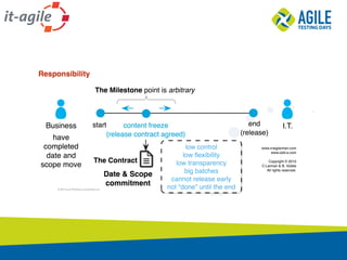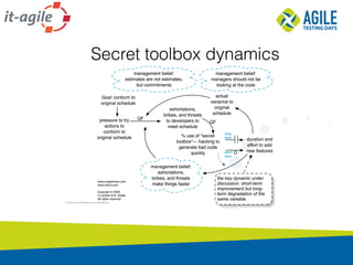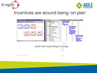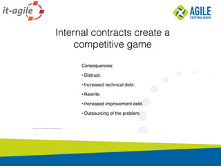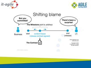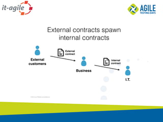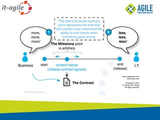 The document discusses strategies for agile adoption, emphasizing a customer-centric approach and the importance of whole product focus. It explores the benefits of feature teams over component teams and highlights ways to eliminate waste in processes. Key concepts include defining product vision, acknowledging contract games, and understanding organizational behavior laws that may hinder change.