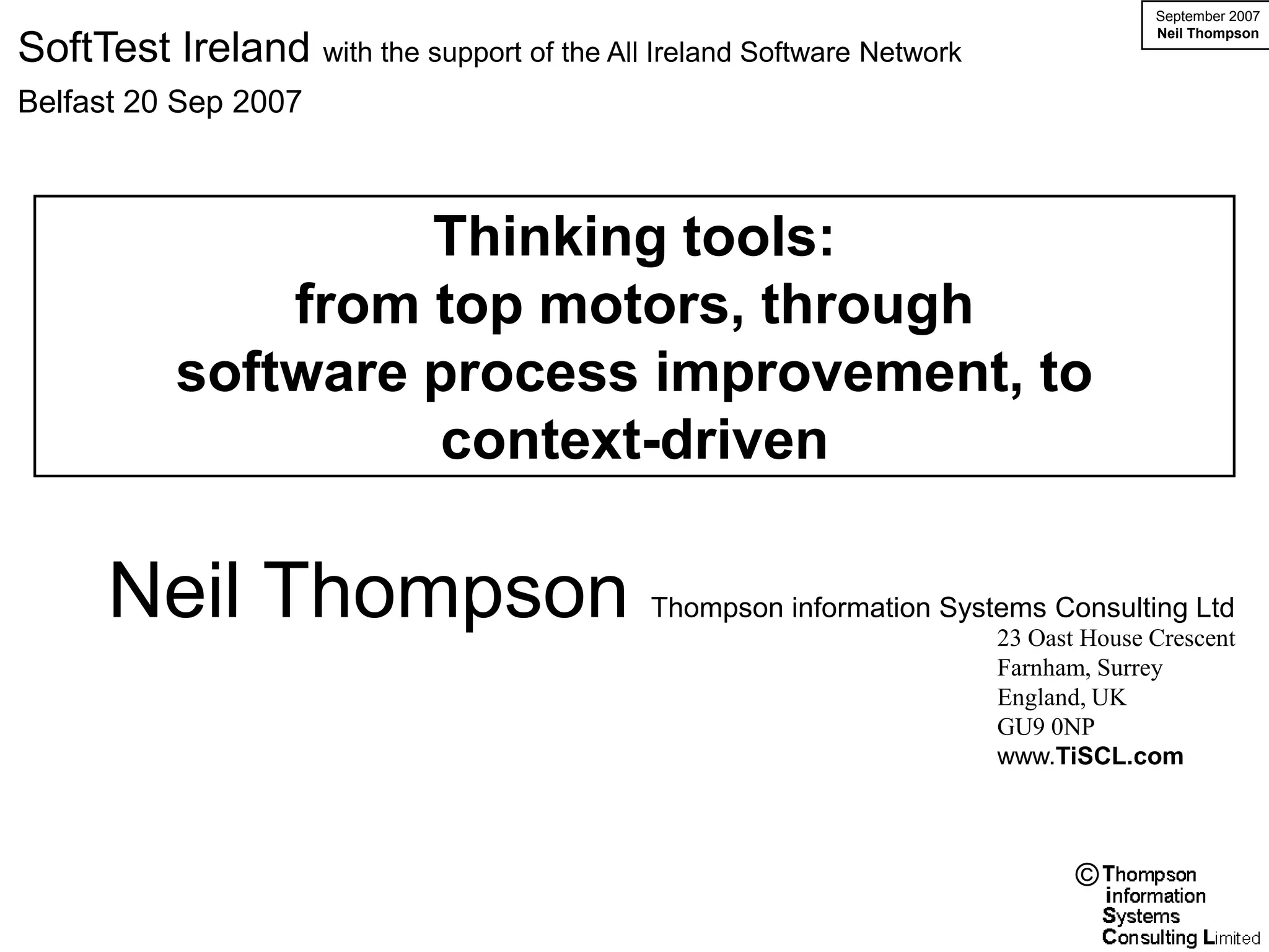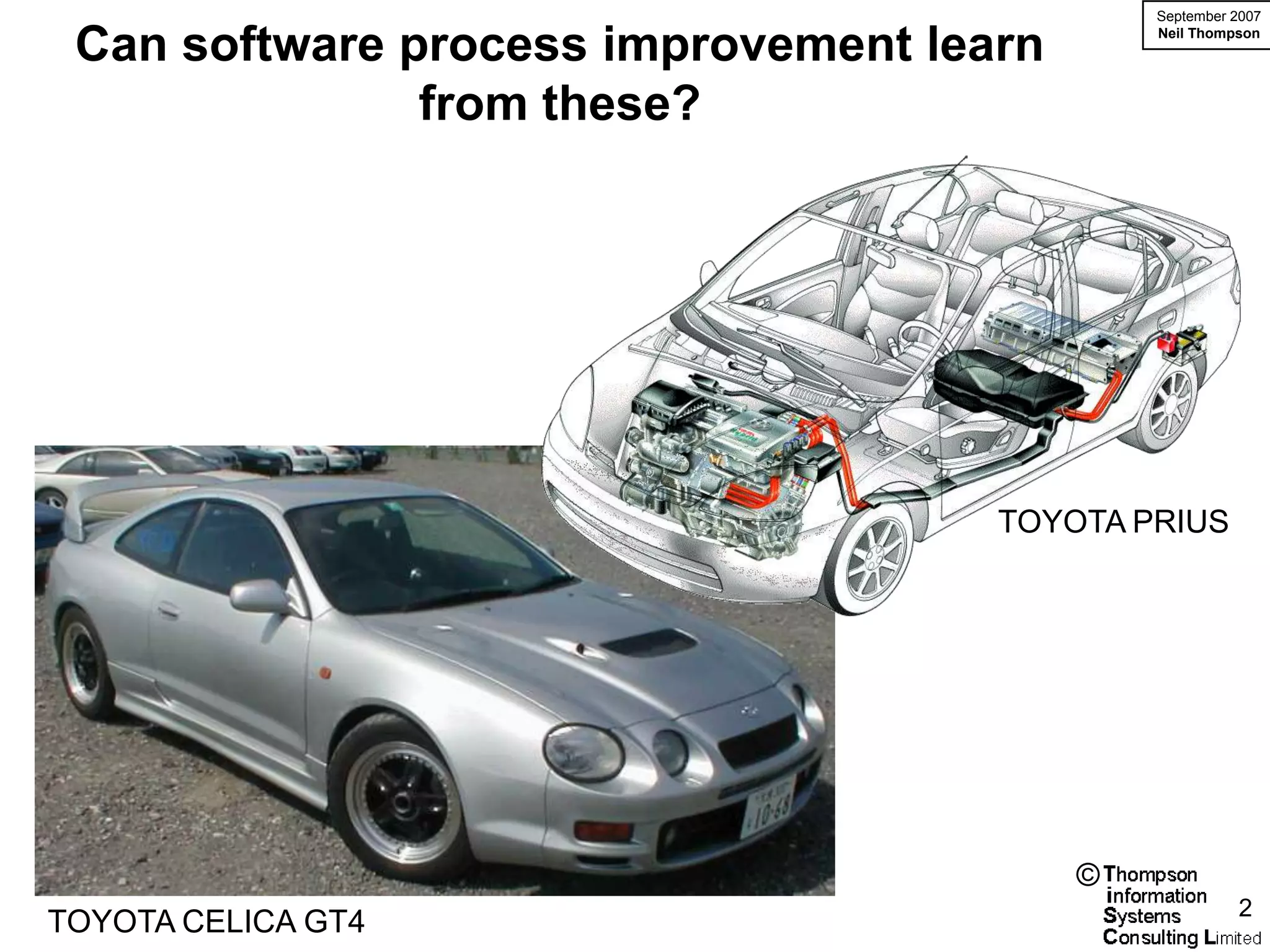 This document summarizes Neil Thompson's presentation on applying principles from manufacturing process improvement to software development processes. Some key points: