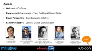 This document summarizes an event about advertising automation. It includes an agenda with speakers from Rubicon Project, Initiative, and Edmunds.com who will provide perspectives on programmatic advertising from buyers and sellers. The document then covers various topics around programmatic advertising including the landscape, how real time bidding works, case studies, and go-to-market strategies for sellers involving the four P's of marketing.