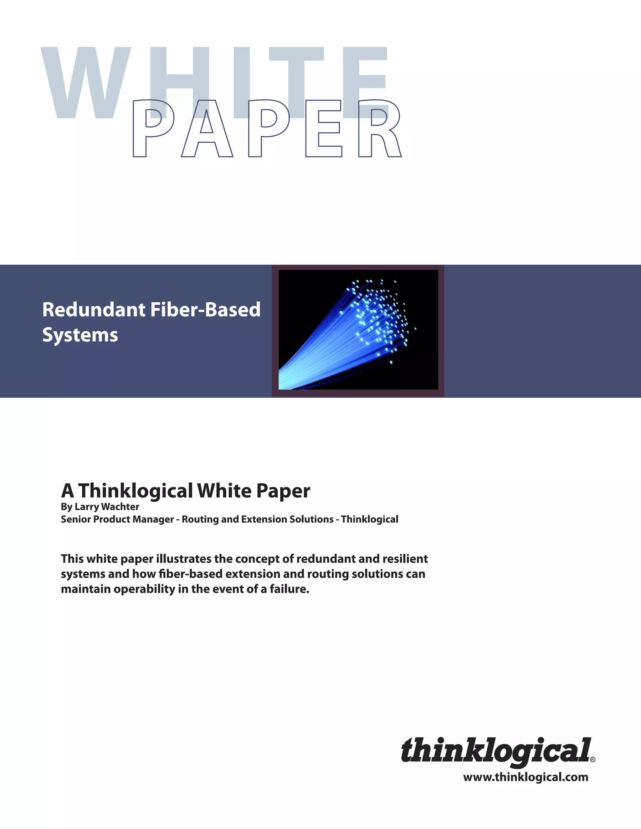 This white paper discusses the importance of redundancy and resilience in fiber-based routing and extension systems to ensure high availability and reliability during failures. It outlines various redundancy models, such as standby and dual modular redundancy, emphasizing that hot standby systems provide seamless operation without data loss. Thinklogical's solutions are designed to support these concepts, minimizing downtime and enhancing overall system integrity in critical environments.