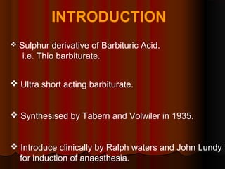 Thiopentone is an ultra short-acting barbiturate used for induction of anesthesia. It works by enhancing the effect of the inhibitory neurotransmitter GABA at GABAA receptors in the brain, causing sedation, hypnosis and general anesthesia. It has a rapid onset of 10-20 seconds when given intravenously and is redistributed and metabolized quickly, typically causing awakening within 5-15 minutes. Common uses include induction of anesthesia and treatment of increased intracranial pressure. Side effects are generally mild and related to its cardiovascular and respiratory depressant effects.