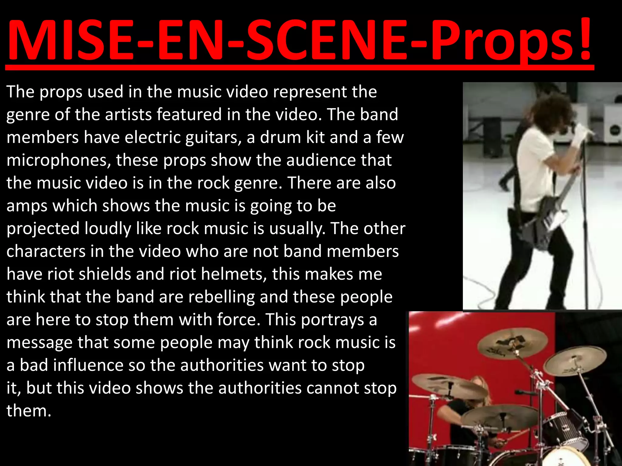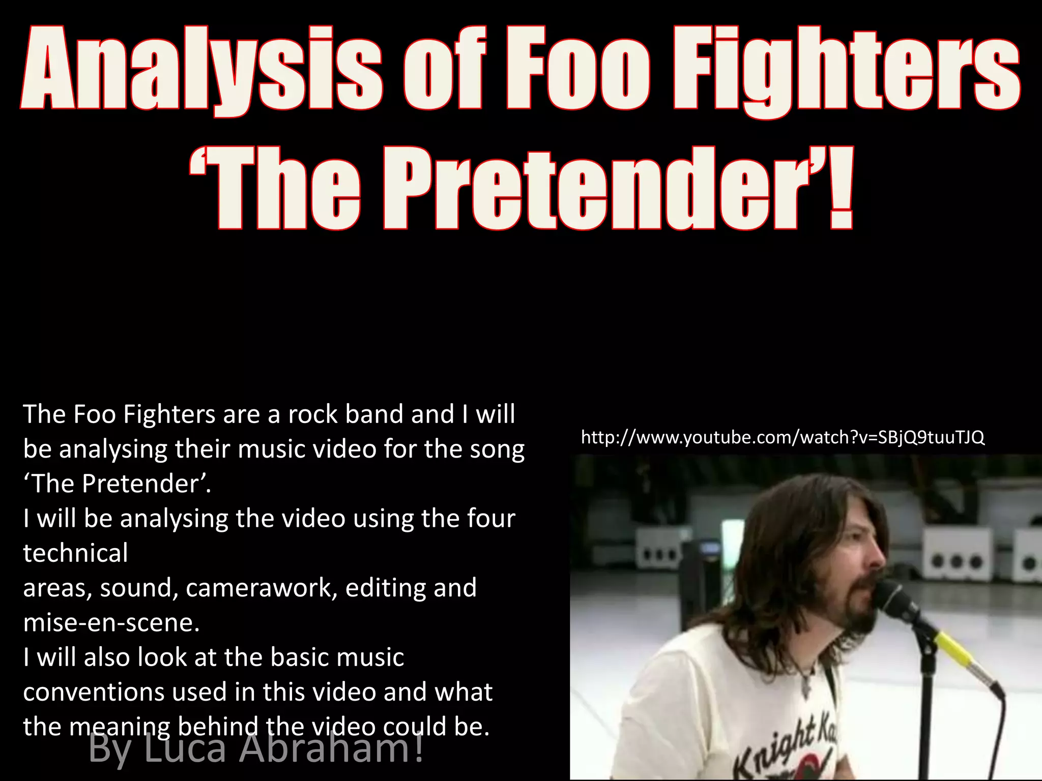 The video analyzes the music video for the Foo Fighters song "The Pretender". It discusses the mise-en-scene including the props, clothing, lighting, and setting of the warehouse. It also covers the camerawork using different shots and angles. The sound is diegetic from the band playing. Editing uses cuts between shots and pacing to match the music. The video depicts a confrontation between the band and riot police authorities.