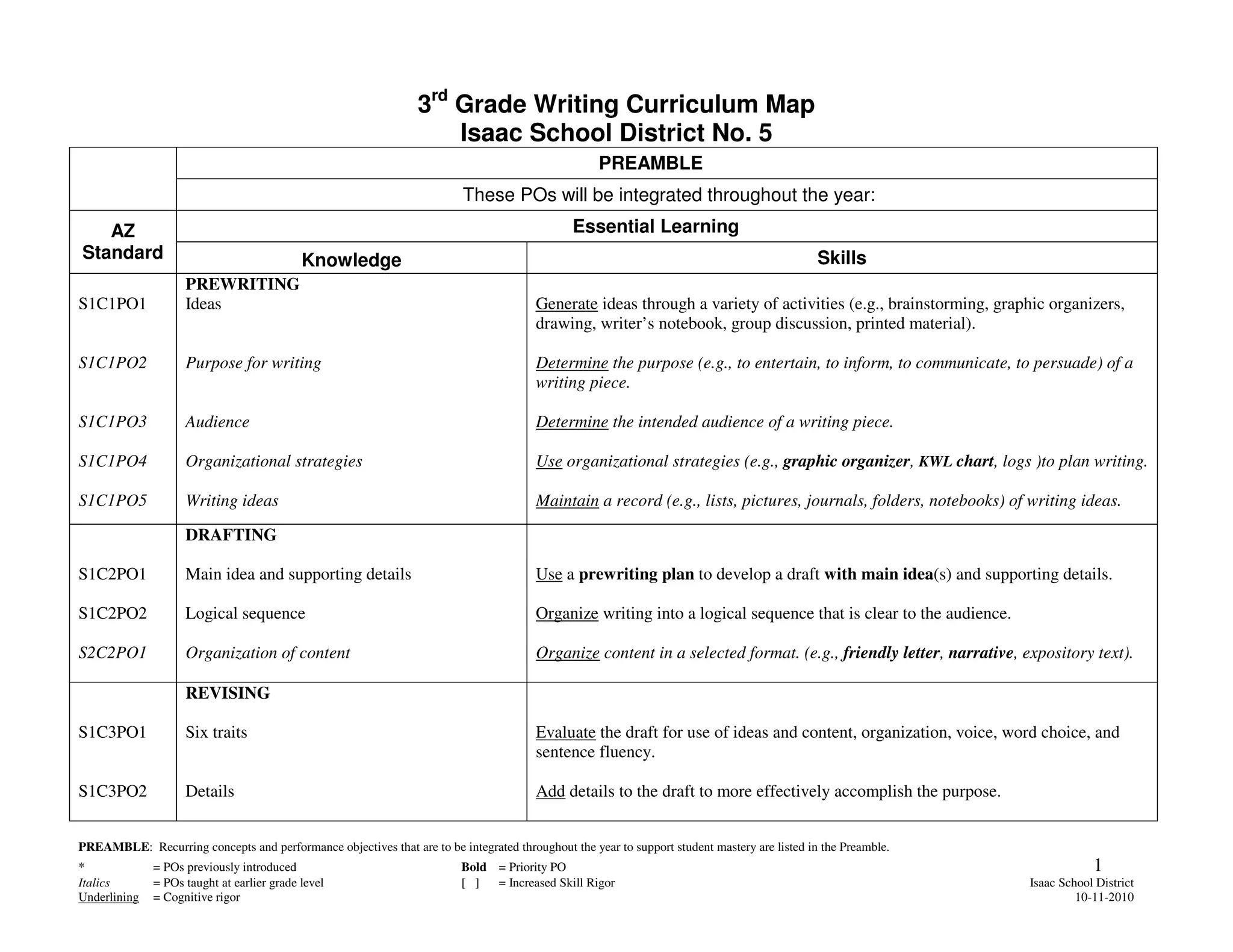 The document provides a curriculum map for 3rd grade writing at the Isaac School District. It outlines performance objectives in areas such as prewriting, drafting, revising, editing, conventions, and publishing. The objectives will be integrated throughout the school year and focus on skills like generating ideas, determining purpose and audience, organizing writing, adding details, editing for conventions, and preparing writing for presentation. Recurring concepts from the preamble will support student mastery of the objectives.