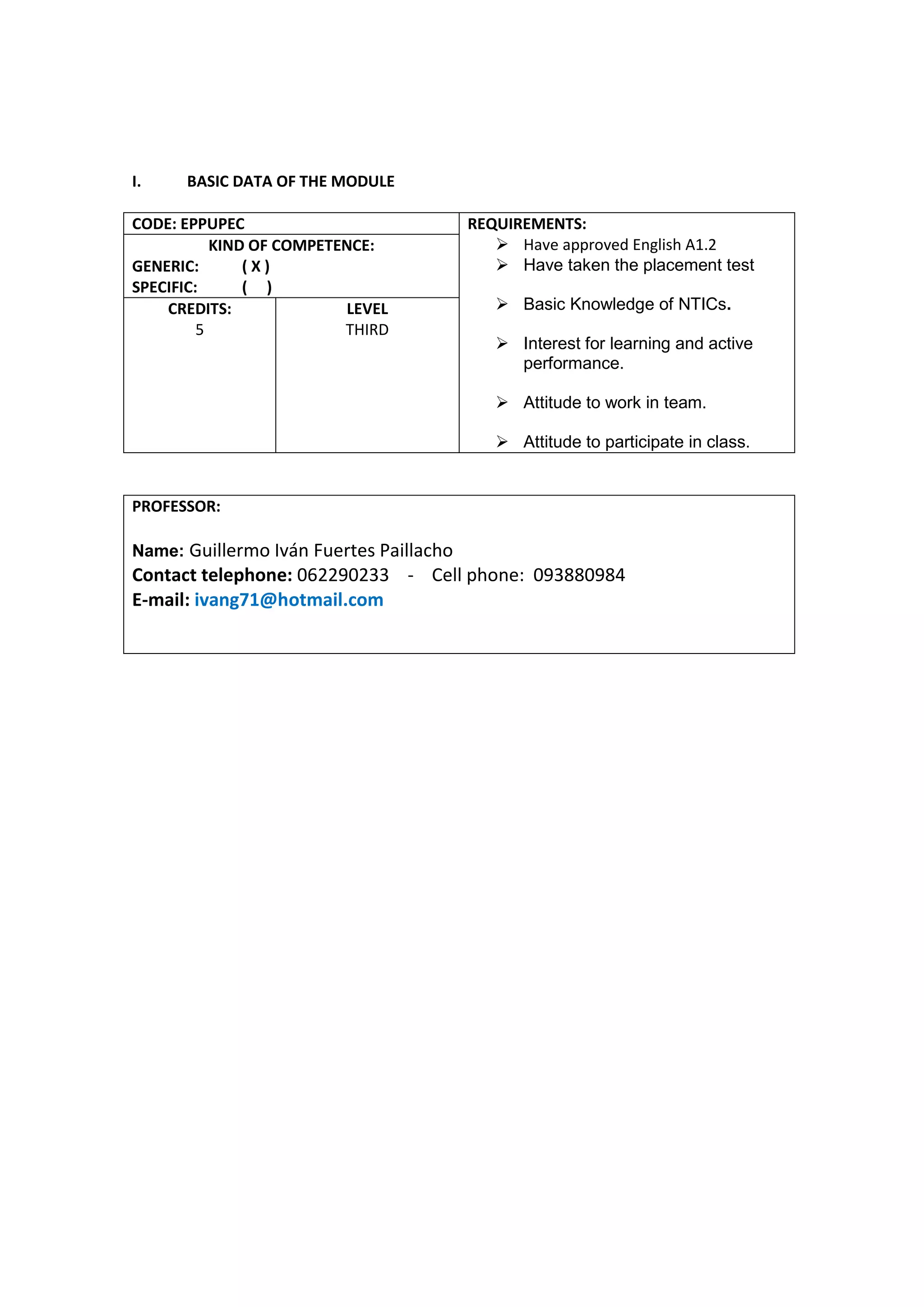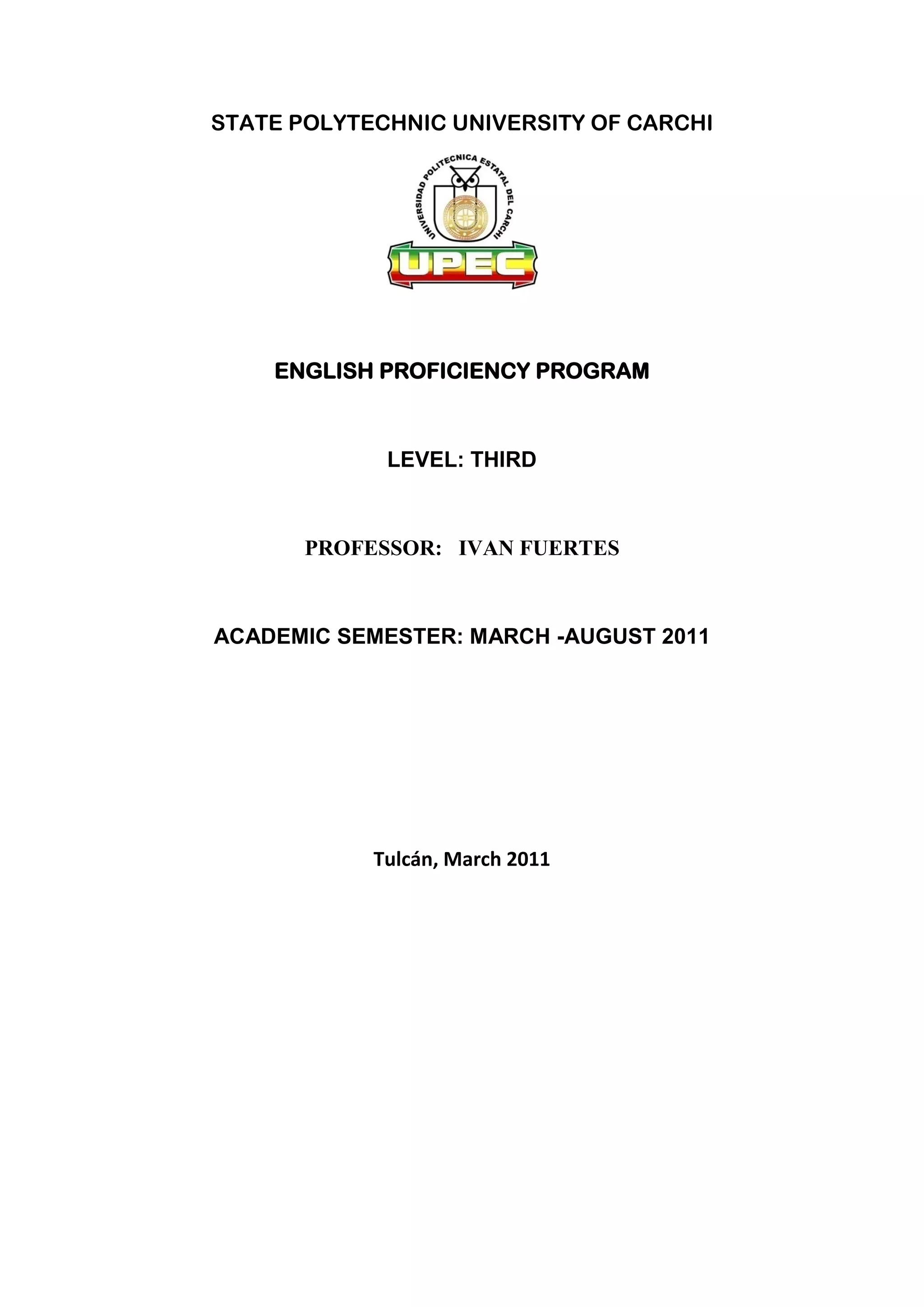 This document provides information about an English proficiency course taught at State Polytechnic University of Carchi in Ecuador from March to August 2011. The course was taught by Professor Ivan Fuertes and was aimed at developing students' macro communicative English skills at the third level. The course utilized various teaching methodologies including a problem-based learning approach and focused on developing competencies around understanding daily routines, spare time activities, and describing personalities and bedrooms in present and past tenses over the course of five modules. Assessment was based on oral and written reports, projects, and competency demonstrations through activities, discussions and role plays.