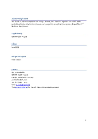 This document summarizes the proceedings of the 3rd National Symposium on the System of Rice Intensification (SRI) in India. SRI is an approach to growing rice that can yield more rice using fewer seeds, less water and fewer chemical inputs while improving soil health. The symposium aimed to discuss strategies for scaling up SRI adoption in India to achieve food security while reducing water conflicts. Key topics included the status and challenges of SRI in India, research priorities, its potential as a pro-poor option, civil society's role in promotion, and experiences from states like Tamil Nadu and Andhra Pradesh. Field visits were also organized to observe SRI rice fields. The symposium concluded with discussions