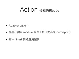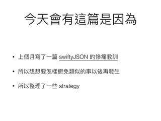 1. The document discusses strategies for developing third party modules, including using frameworks/libraries like SwiftyJSON and avoiding optimizations in favor of strategies.