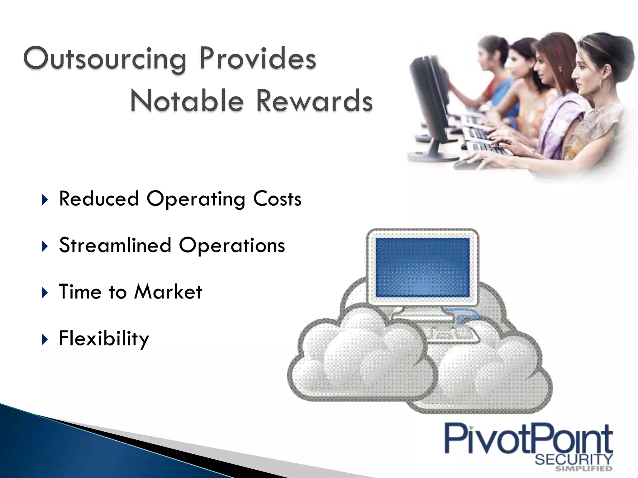 This document discusses outsourcing and the notable risks and rewards it provides. While outsourcing can reduce costs and increase flexibility, it also carries risks such as data breaches, failure to comply with regulations, and intellectual property disclosure. When outsourcing, organizations must be able to prove to regulators that key vendors are secure and compliant. Outsourcing responsibility and liability is not possible. Organizations must integrate information security into their vendor management programs to properly assess and manage risks from third parties.