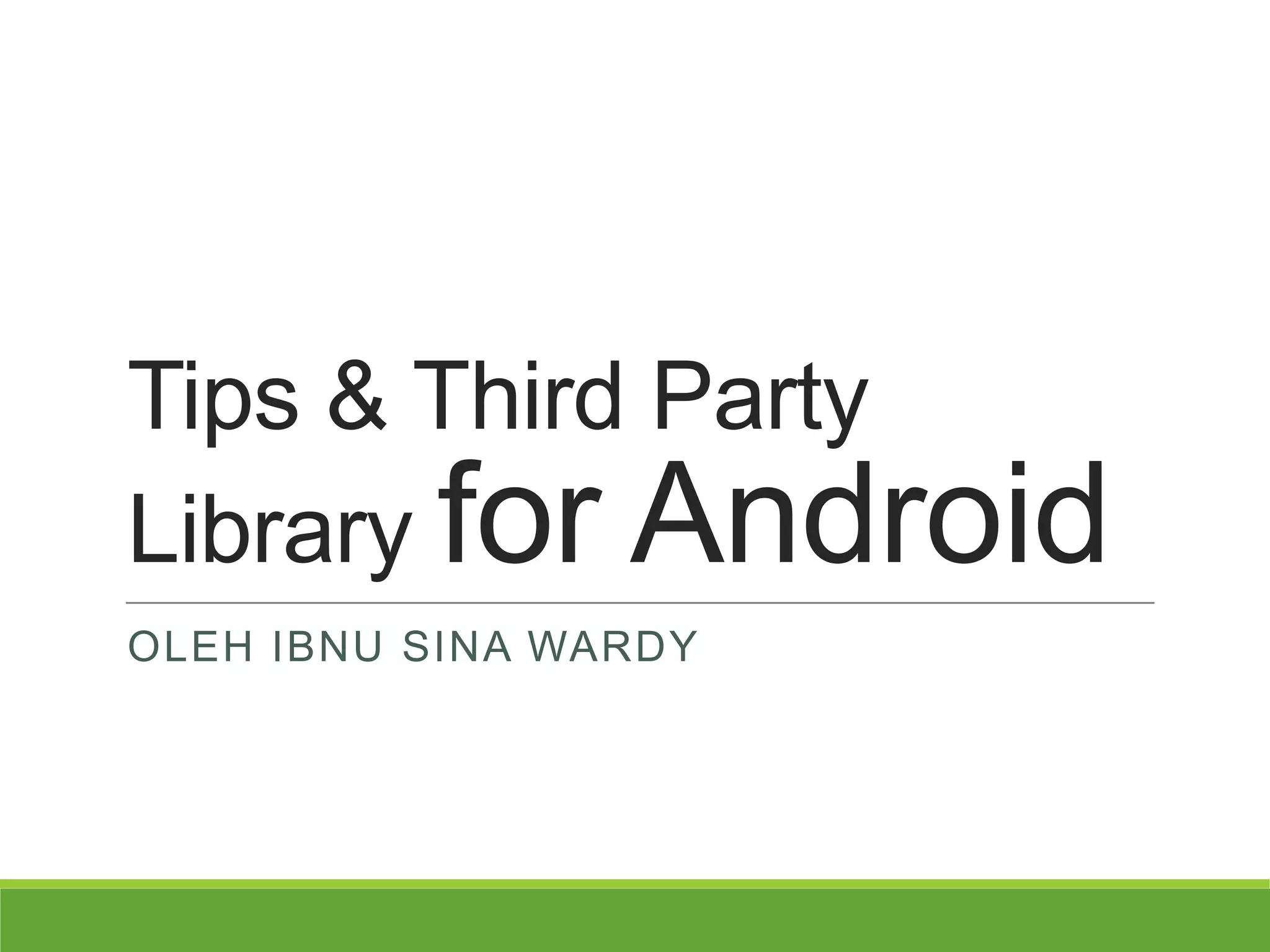This document discusses various tips and third party libraries for Android development. It covers using the ActionBar, navigation drawers, JSON parsing, and dimensions for tablets. It provides code examples for implementing an ActionBar for pre-Honeycomb devices using ActionBarSherlock, creating navigation drawers with DrawerLayout, parsing JSON using Gson, and defining dimension resources for different screen sizes and densities.