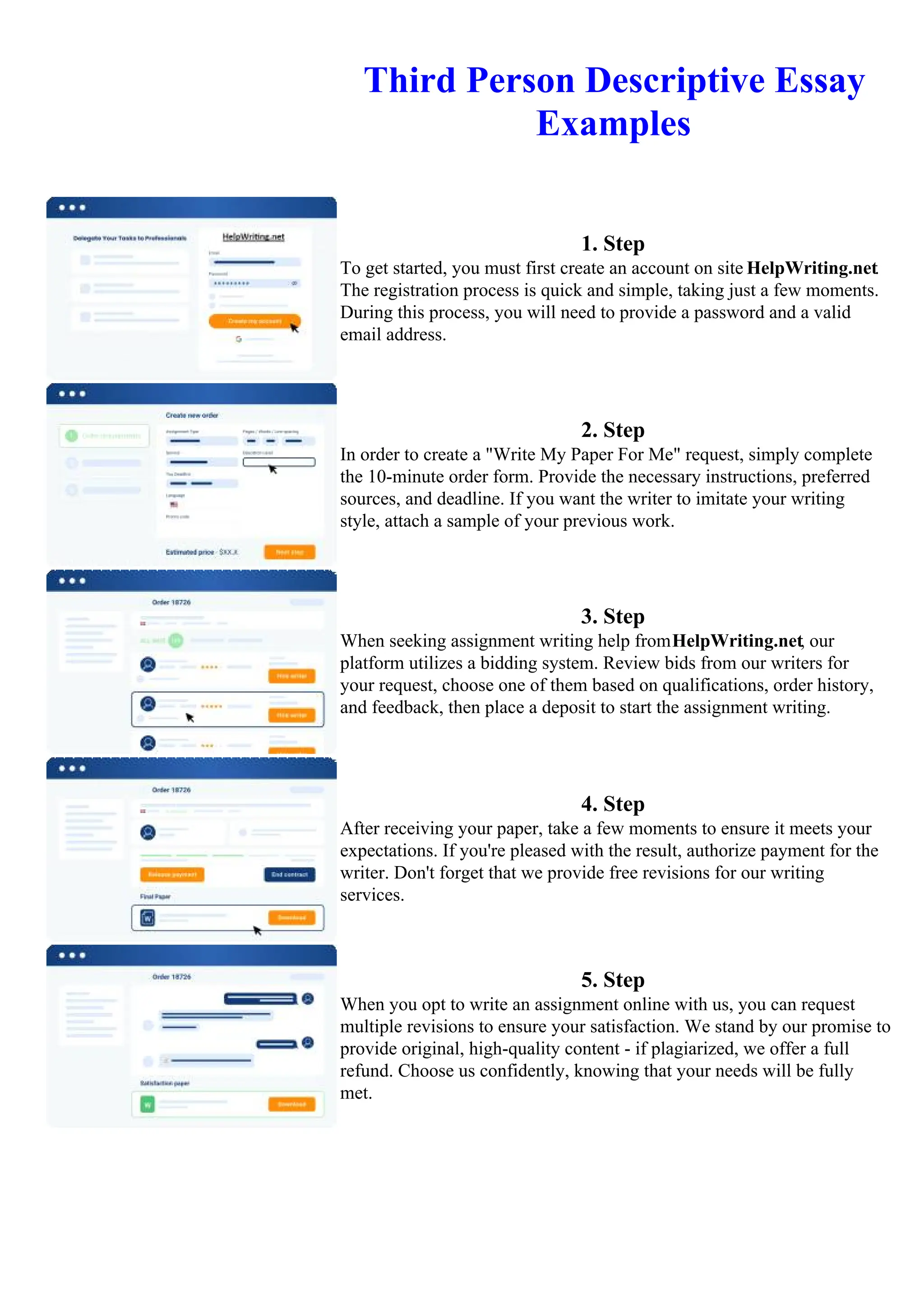 The document provides instructions for seeking writing help from HelpWriting.net. It outlines a 5-step process: 1) Create an account with a password and email. 2) Complete a 10-minute order form with instructions, sources, and deadline. 3) Review bids from writers and choose one based on qualifications. 4) Review the completed paper and authorize payment if satisfied. 5) Request revisions to ensure satisfaction, with a refund offered for plagiarized work.