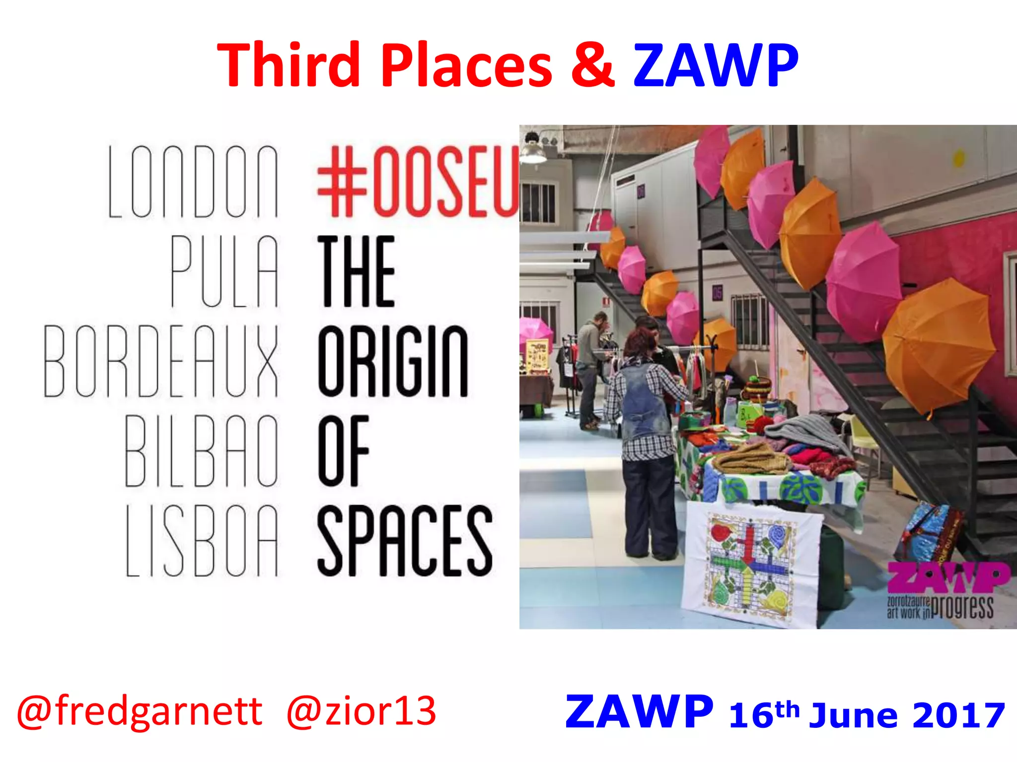 This document discusses third places and the Origin of Spaces (oosEU) project. It defines third places as community spaces separate from home and work, like coffee shops, and explains their importance for building social connections and enabling innovation. The document outlines oosEU case studies on third place projects focused on social enterprise, participatory governance, ecological transition, and local partnerships. These include coworking hubs in London, Bilbao, Lisbon, and community organizations in Pula and Bordeaux. Resources for learning about each case study are provided in the Origin of Spaces toolbox. In summary, the document explores how third places can foster community and creative change, and highlights oosEU examples working on these goals.