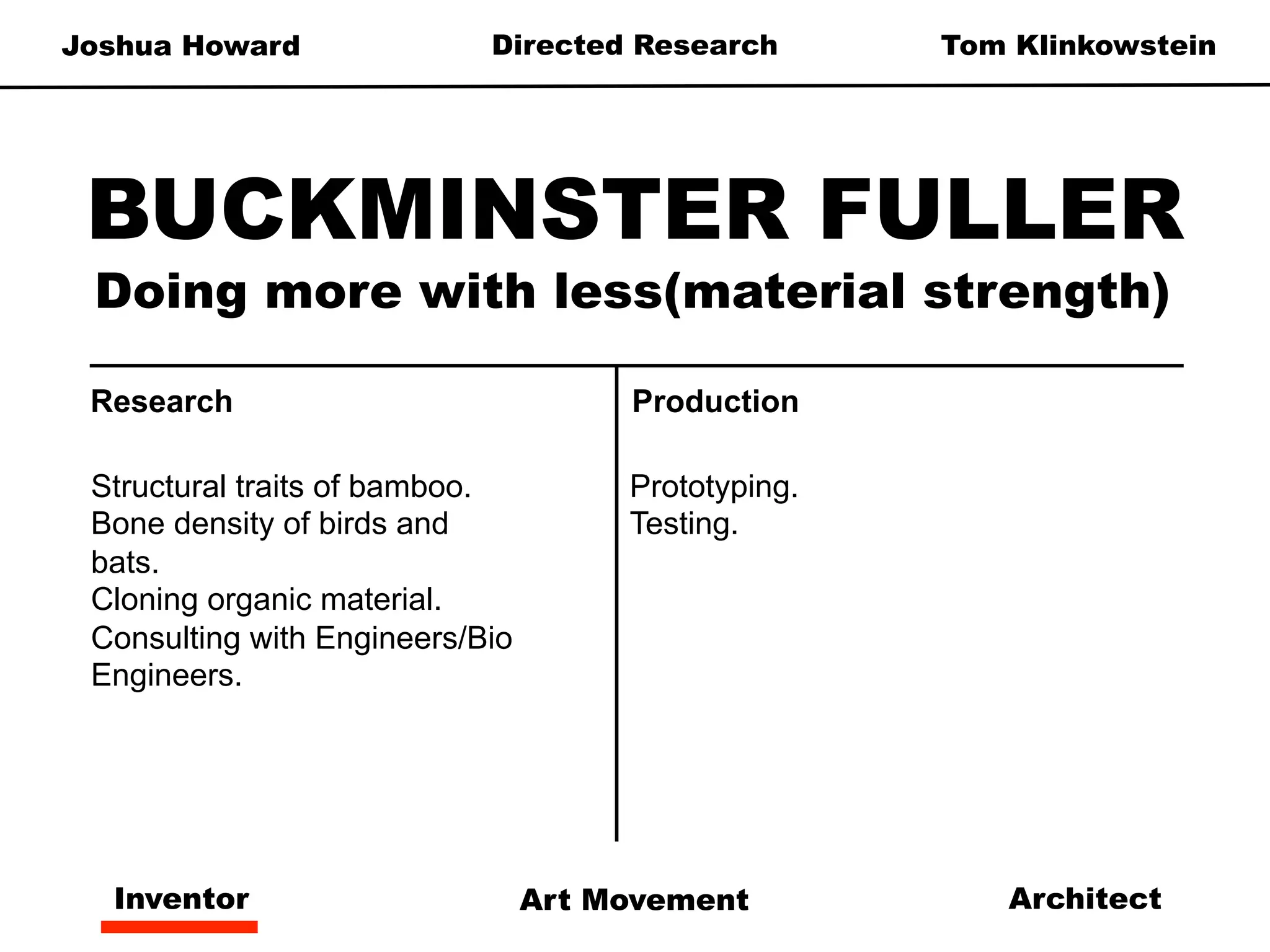 The document outlines several directed research projects focused on Buckminster Fuller, De Stijl art movement, sustainability in architecture, and improving company work environments. It discusses methodologies for each project including conducting observational research, developing taxonomies, interviewing experts, testing hypotheses, and using mock-ups/models. Research production methods include studying structural traits in nature, human circulatory systems, waste management systems, and social psychology factors that impact workplace satisfaction. The document also provides tips for acquiring a fresh perspective during the initial design process and suggestions for how to approach research across multiple disciplines.