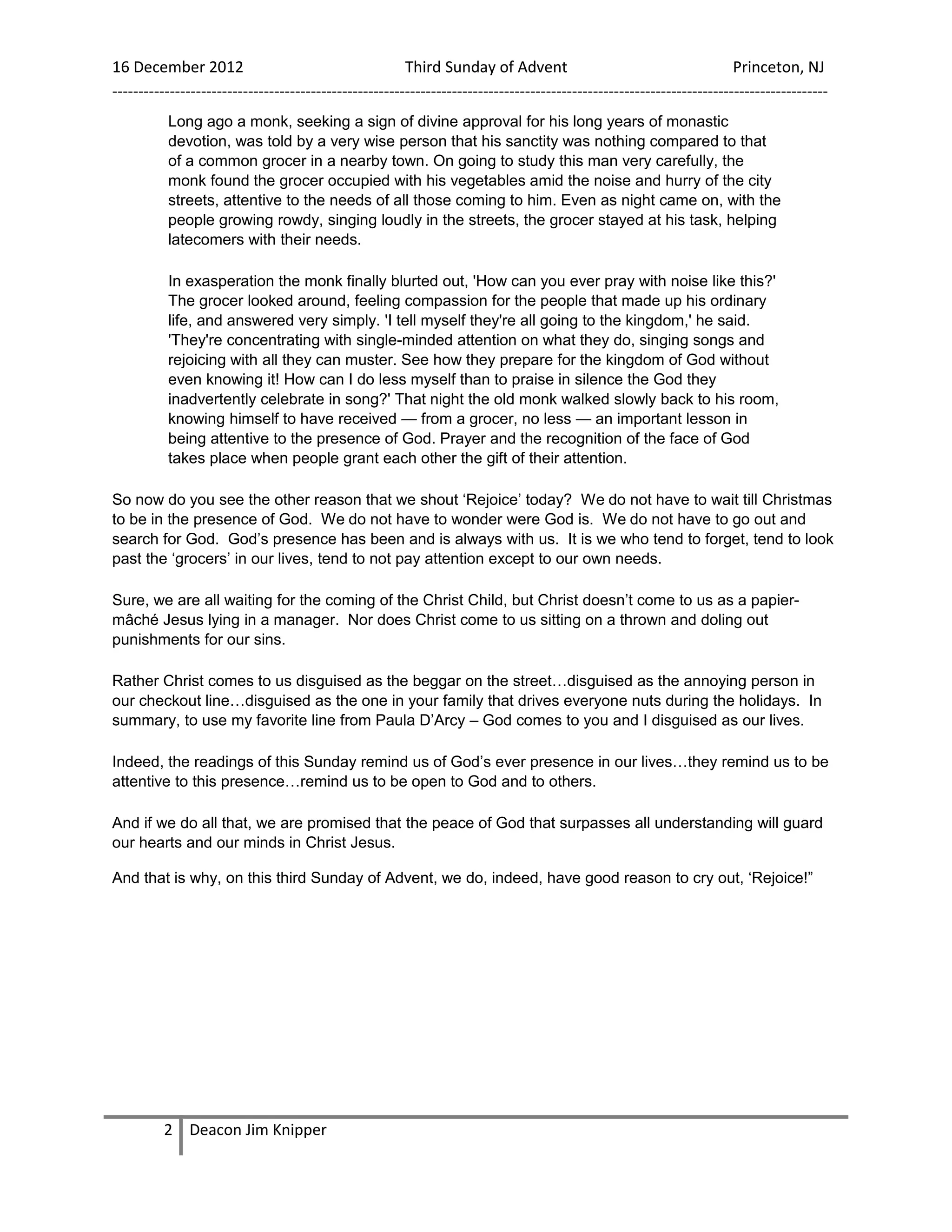 This document summarizes the third Sunday of Advent known as Gaudete Sunday, when Christians are called to rejoice in anticipation of Christ's coming. The readings from Zephaniah, Paul, and Luke encourage rejoicing even in difficult times because God is present with us. A story is shared of a monk learning from a grocer that God's presence can be found in attending to others and their celebration, even amid noise. We are reminded that Christ comes disguised in others around us, and that attentiveness to God and others allows us to experience God's peace.