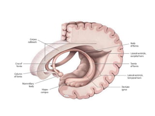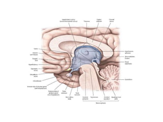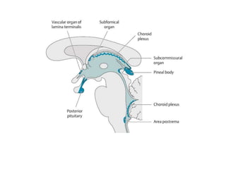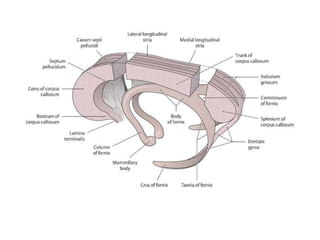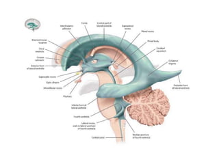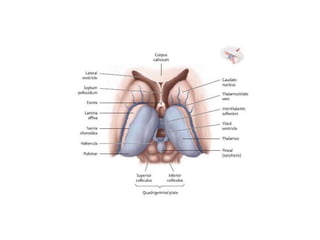 The document provides a detailed anatomical overview of the third ventricle, including its structure, boundaries, the fornix's components, and surgical anatomy. It describes the roof, floor, and walls of the ventricle, as well as communication with the lateral ventricle and drainage into the aqueduct of Sylvius. Additionally, it outlines various surgical approaches to the third ventricle and the associated vascular structures.