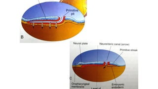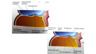 3. Gastrulation involves cell movements that position the germ layers and establish the body plan and central axis of the embryo through structures like the primitive streak, primitive groove/pit, and notochord. The fate map of tissues is also established.