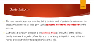 During the third week of development, gastrulation occurs which establishes the three germ layers - ectoderm, mesoderm, and endoderm. Gastrulation begins with the formation of the primitive streak on the surface of the epiblast. Cells migrate through the primitive streak and node, some displacing the hypoblast to form endoderm, while others become mesoderm between the endoderm and remaining ectoderm. This results in the formation of the notochord, and the germ layers differentiate into various tissues and organs.