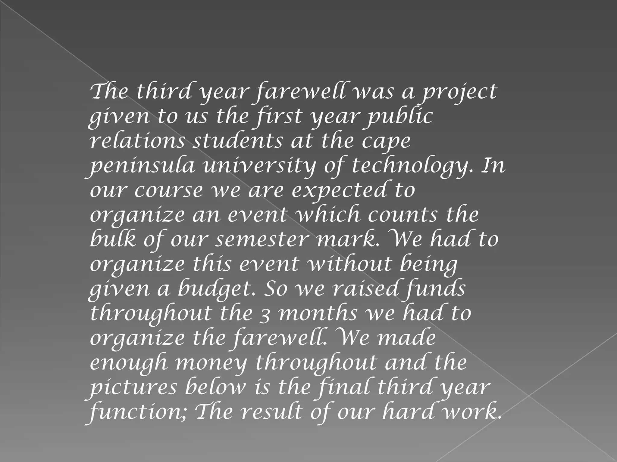 The first year public relations students at Cape Peninsula University of Technology were assigned to organize a farewell event for third year students as a class project, which would count significantly towards their semester grade. They had to plan and fund the event without a budget, so spent three months raising funds. Through their efforts, they were able to successfully hold the third year farewell function without a budget, as evidenced by the photos of the decorated event space, photo booth, gift bags, and tables.