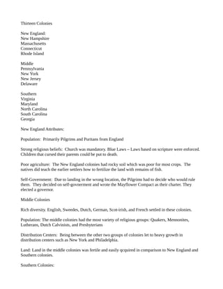The document summarizes the 13 original colonies divided into three regional groups: New England, Middle, and Southern colonies.