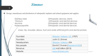 This document discusses several companies that develop biomaterials for biomedical applications. Zimmer designs, manufactures, and distributes orthopedic implants using materials like stainless steel, titanium, alumina, and hydroxyapatite. MATECH Biomedical Technologies develops biomaterials through chemical polymerization methods. Baxter International develops technologies related to blood and circulatory systems using materials like Dacron for vascular grafts. Polymer Technology Group synthesizes and manufactures new polymer products like poly(methyl methacrylate) and polyurethanes. The document also briefly mentions Howmedica/Stryker Orthopaedics, Molecular Geodesics Inc, and several other biomaterials companies.
