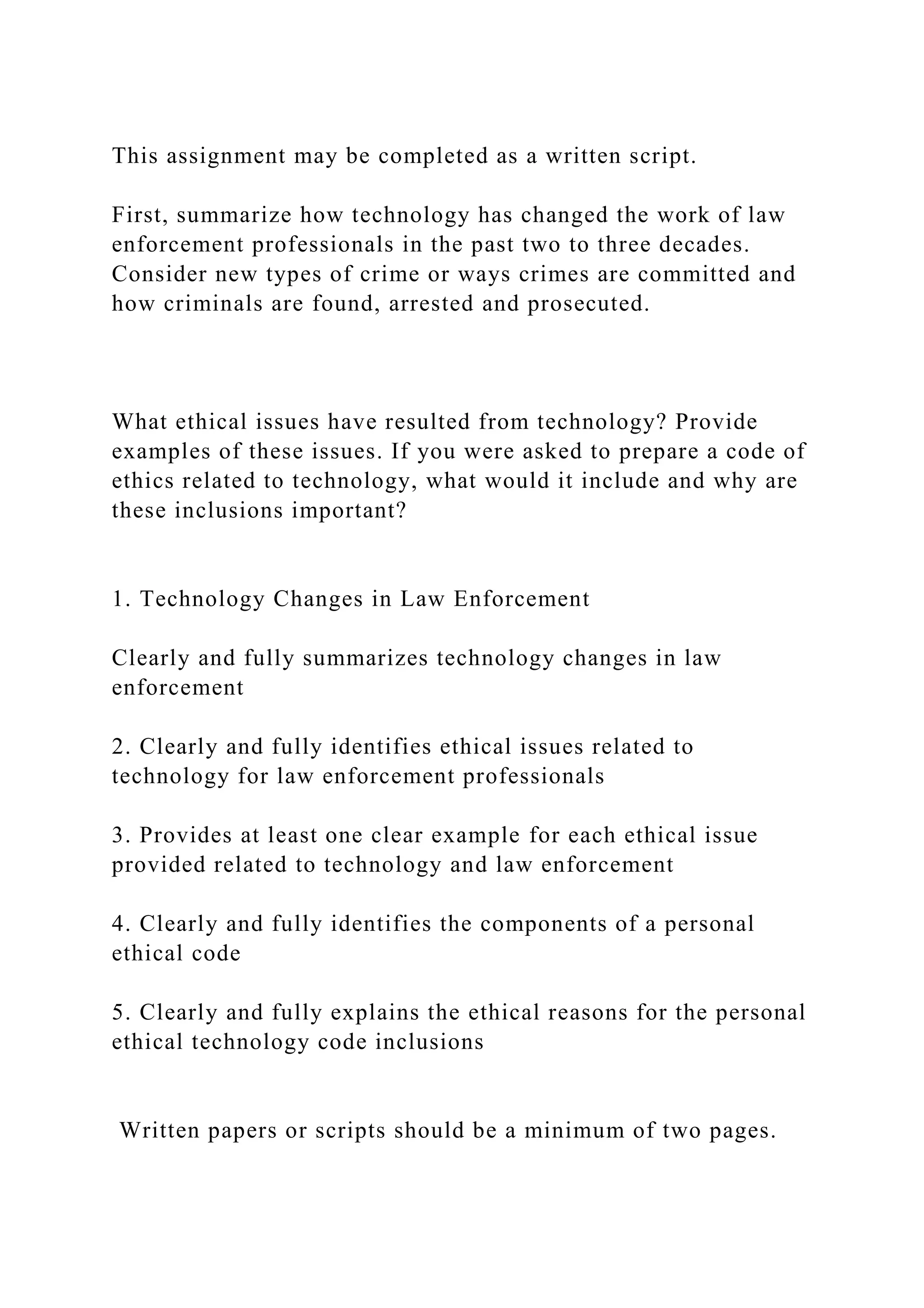 The assignment requires an exploration of how technology has transformed law enforcement over the past few decades, including new crime types and methods for solving crimes. It also calls for a discussion of ethical issues arising from these technological advancements, along with examples, and the creation of a personal code of ethics addressing these concerns. The paper should be comprehensive, spanning at least two pages, covering technological impacts, ethical dilemmas, and the rationale behind ethical guidelines.
