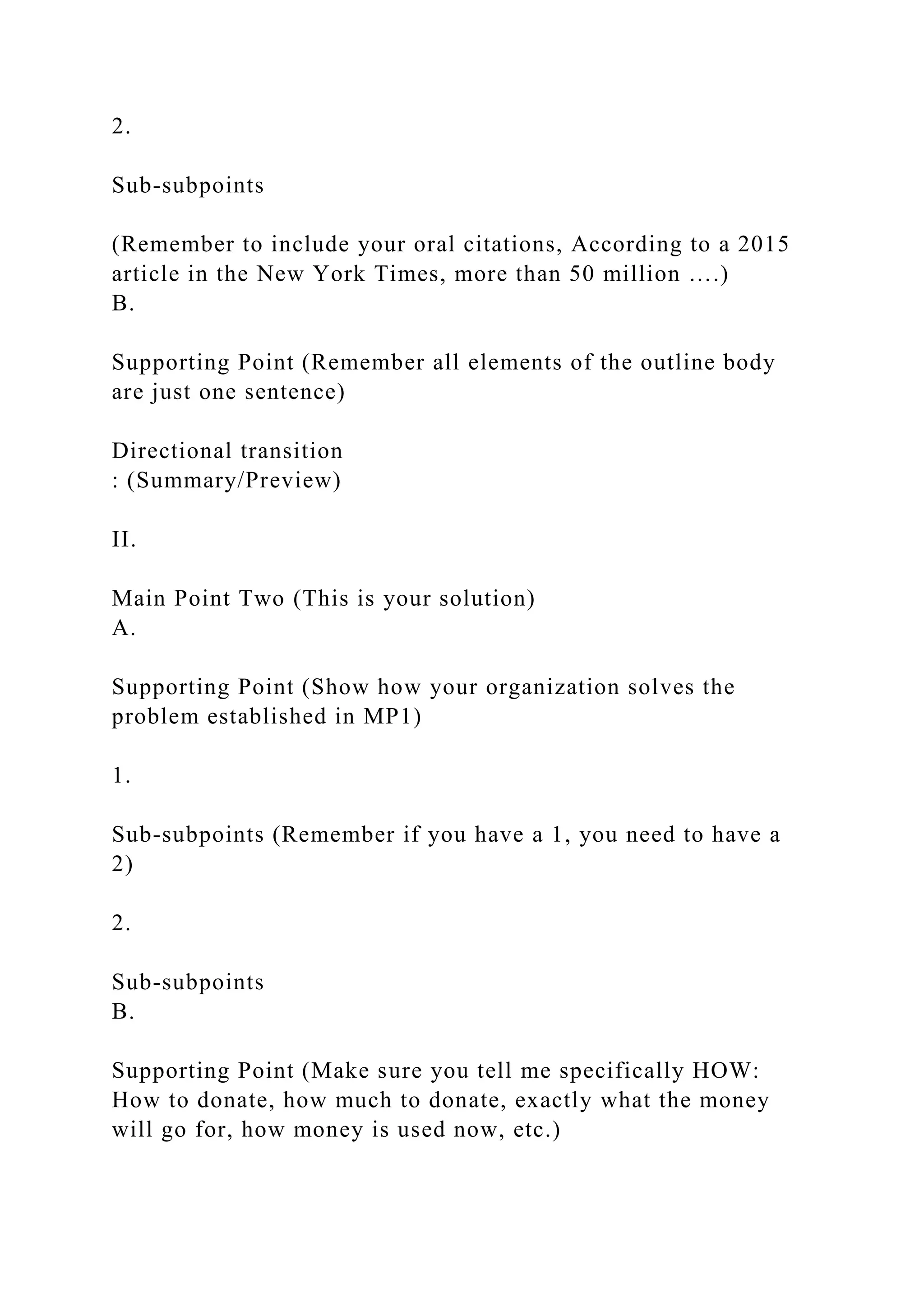This document outlines the requirements for a persuasive speech assignment, including an introduction with an attention getter, credibility statement, and thesis. The body must have two main points with supporting evidence from credible sources cited verbally and in references. An organizational pattern, visual aid, conclusions, and adherence to a 6-8 minute time limit are also required. Students must conduct an audience analysis survey and adapt the speech based on the results. Formal outlines and extemporaneous delivery are expected.