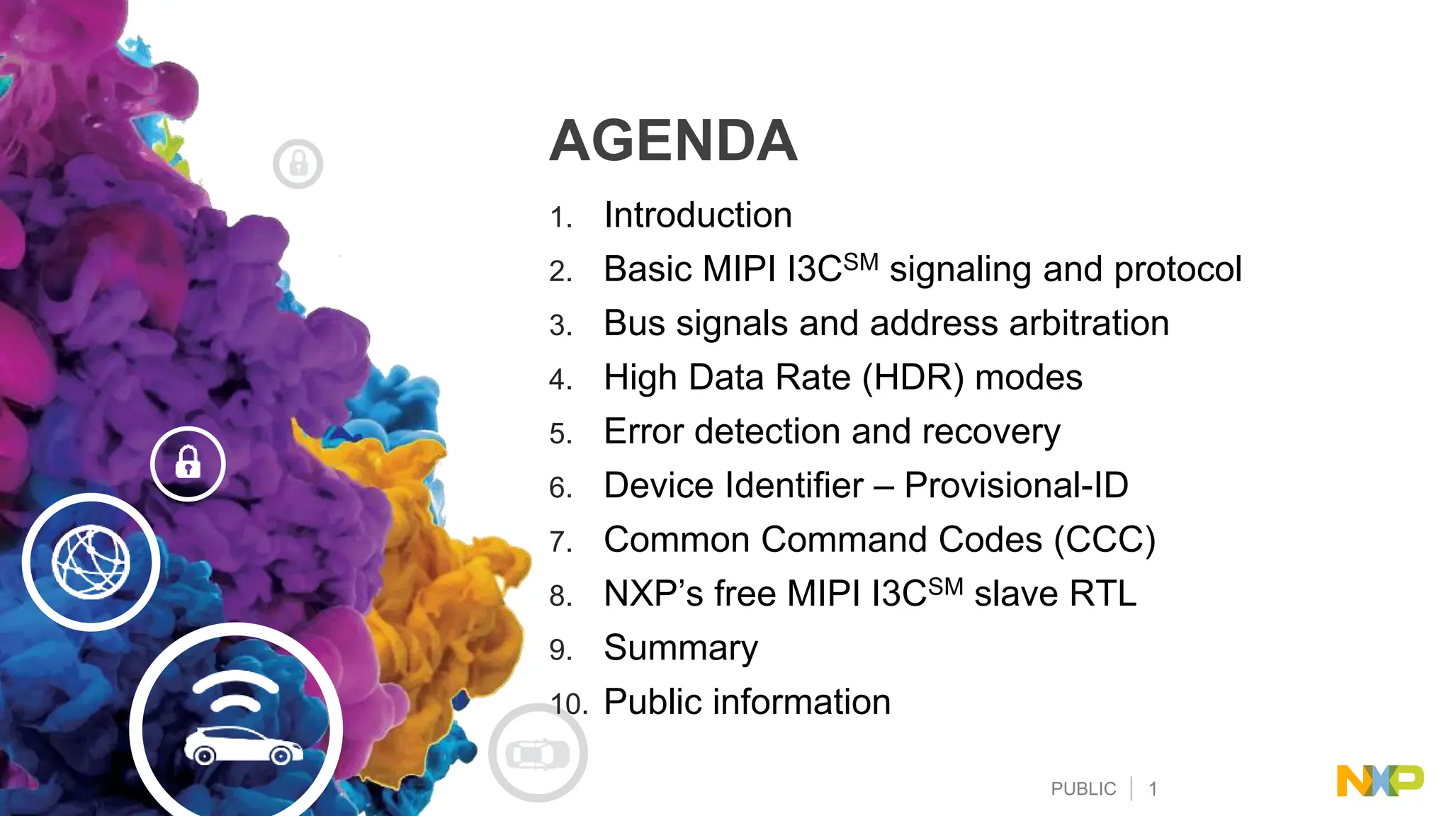 The document provides an overview of the MIPI I3C technology, which is a successor to I2C, emphasizing its improvements in data rate, energy efficiency, and support for additional features like in-band interrupts. It contrasts MIPI I3C's capabilities against I2C and SPI in terms of signaling, protocol, and bus architecture. Key topics include data rates, error detection, device identification, and the roles of masters and slaves within the MIPI I3C framework.