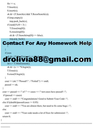 The document contains a C++ program implementing a binary search tree (BST) with functions such as insert, search, and erase, along with a testing client to validate its functionality. There are indications of various bugs and incomplete features in the implementation, leading to requests for help. Additionally, comments prompt users not to modify certain files and provide status messages based on test case results.