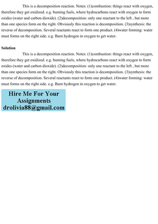 The document discusses different types of chemical reactions, primarily focusing on decomposition reactions, where one reactant produces multiple products. It also touches on combustion, which involves oxidation of materials with oxygen, and synthesis, which is the reverse of decomposition. Examples include burning hydrocarbons and hydrogen to illustrate these processes.