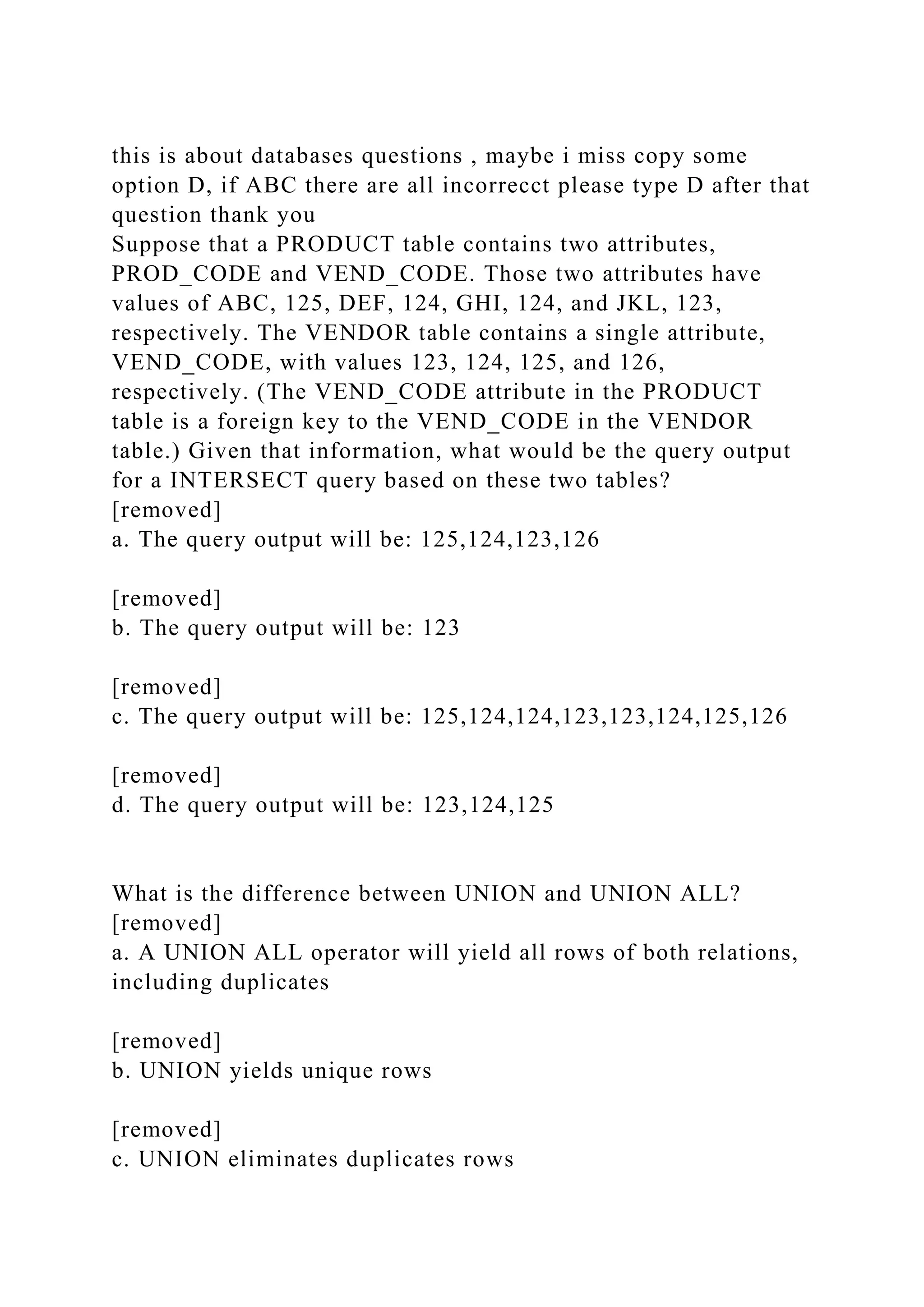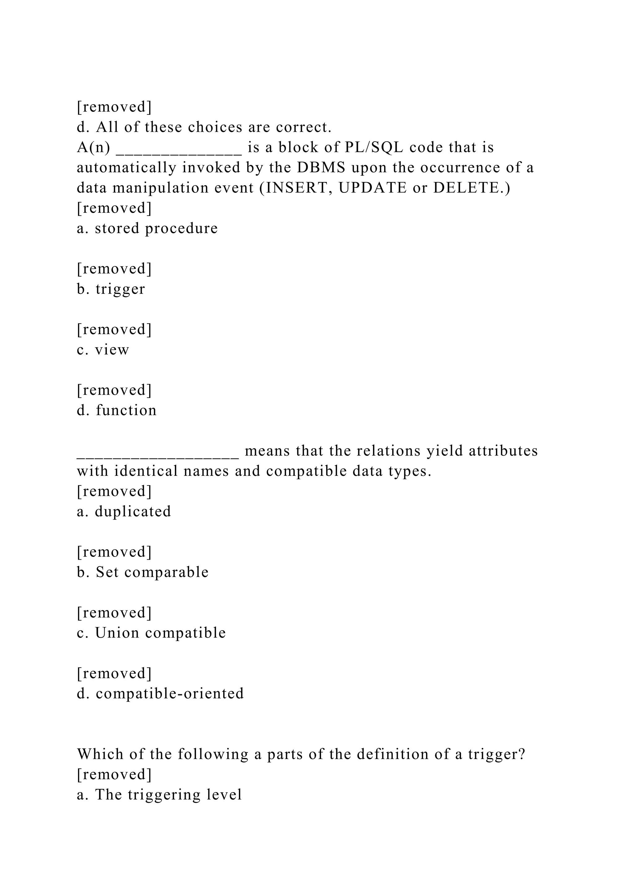 The document discusses various database concepts, including SQL queries, joins, triggers, sequences, and subqueries, providing examples and possible query outputs. It emphasizes the correct use of SQL operators like UNION, INTERSECT, and MINUS, as well as the implications of using triggers in relational databases. Additionally, it contains hypothetical questions and answers pertaining to database operations and the expected results from different SQL statements.