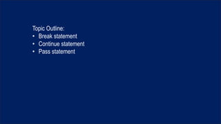 The document provides an overview of Python's loop control statements: break, continue, and pass, describing their functionality and syntax within loops. It includes examples to illustrate how each statement alters loop execution, alongside activities for practical application. Additionally, it encourages understanding of these concepts through group tasks and discussions on their relevance in programming.