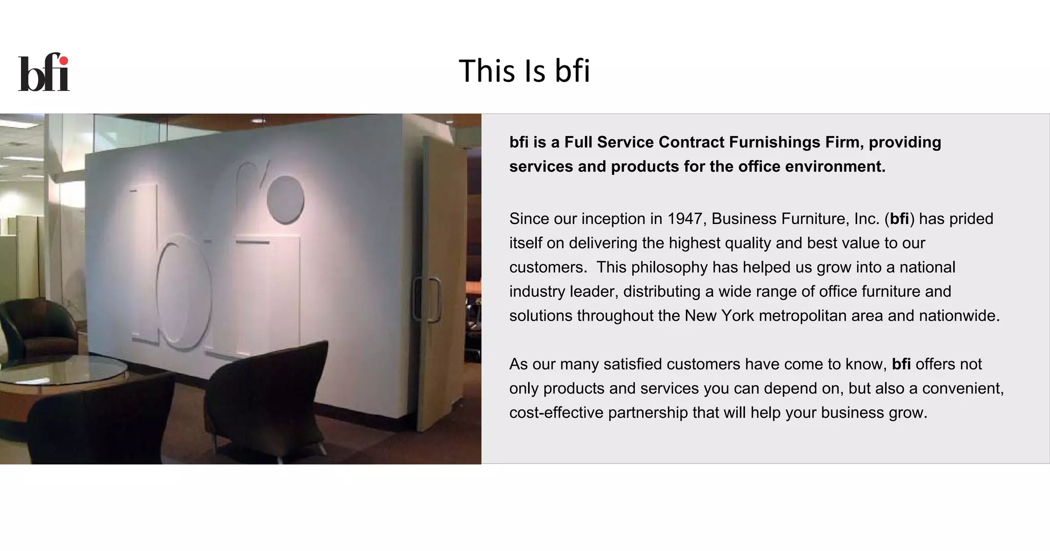 bfi is a full-service office furnishings company that has served customers for over 65 years nationwide. It provides a wide range of office furniture, flooring, installation and other services. bfi works with corporate, healthcare, government and other clients to design efficient office spaces. It prides itself on high quality products and services, long-term relationships, and ensuring customer satisfaction.