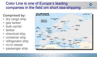 Color Line is one of Europe's leading short sea shipping companies operating various types of vessels. It invested 7.5 billion NOK in new ships between 2004-2008, including the M/S Color Fantasy and M/S Color Magic ferries between Oslo and Kiel. The company reorganized in 2004, reducing its fleet from 10 to 6 ships, routes from 6 to 4, and ports from 10 to 7, while increasing productivity and profitability. Color Line now operates 4 routes between 7 ports with around 3,000 employees and an annual turnover of 4.5 billion NOK.