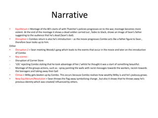 This document provides context and analysis of the film "This is England". It discusses how the film depicts the struggles of working class characters in 1980s Britain under Margaret Thatcher's government. Unemployment was high due to factory closures, leaving many without work. Racism was also prevalent. The film uses its setting, characters, and cinematography to convey the social and economic hardship of the time period.