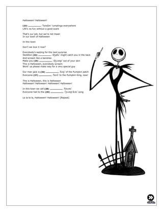 This document appears to be lyrics to the song "This is Halloween" from the movie The Nightmare Before Christmas. The lyrics describe Halloween imagery like pumpkins, ghosts, monsters hiding in the dark and references the town of Halloween. It celebrates the strange and scary elements of the holiday through vivid descriptions and references common Halloween activities like trick-or-treating.