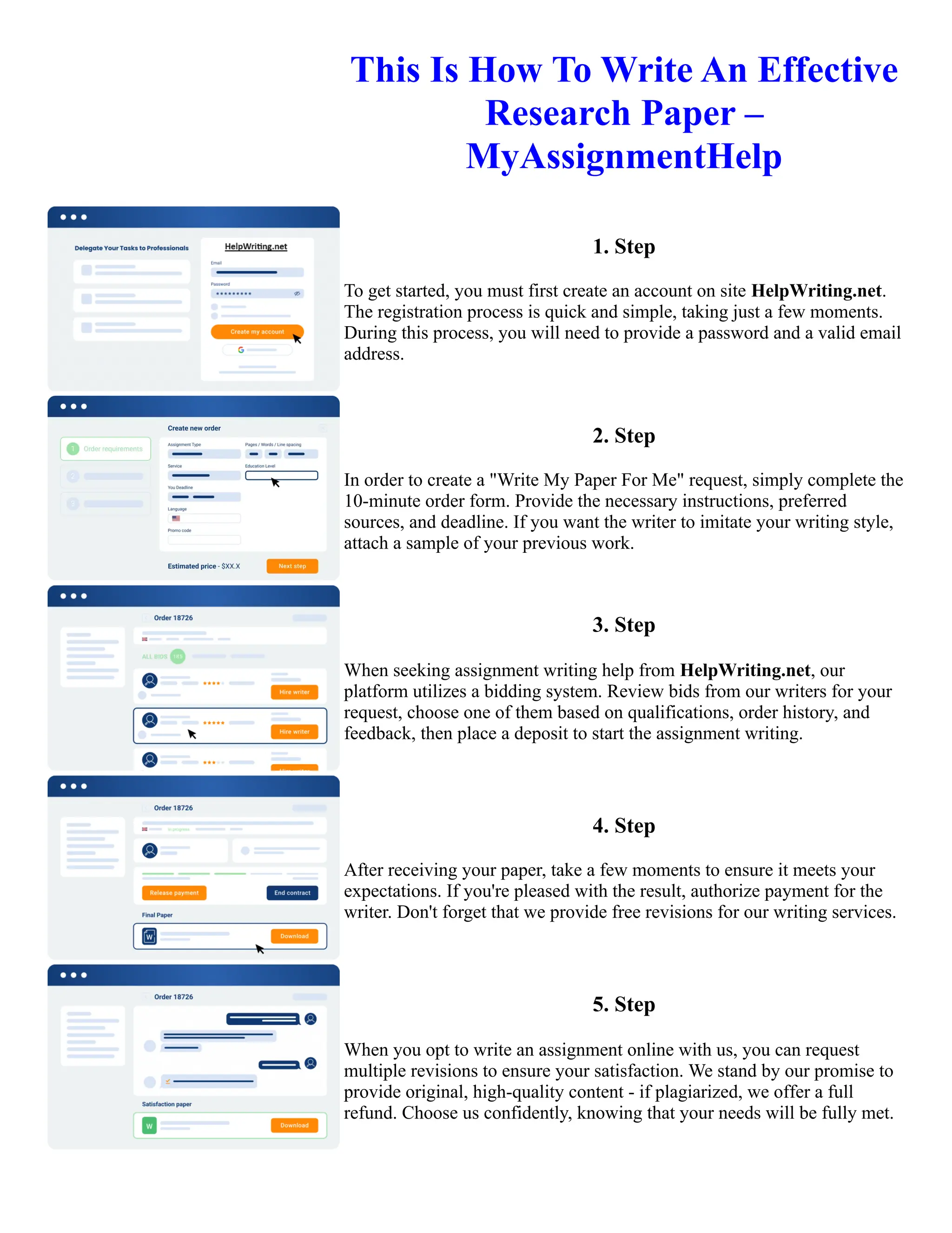 The document outlines a 5-step process for requesting an assignment to be written by an online service, including completing an order form, reviewing writer bids, selecting a writer based on qualifications, placing a deposit, and reviewing and authorizing payment for the completed paper if satisfied. It notes that the service allows for multiple revisions to ensure customer satisfaction and promises original, high-quality content with refunds offered for plagiarized work. The process is described as a way to get online assistance writing an assignment with guarantees of meeting customer needs.