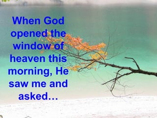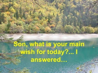 The document shares a message that was received from God asking what the sender's wish for the day was. Their wish was for protection and provision for the person reading the message and their family. It goes on to encourage passing the message along before a certain time and shares messages about angels, prayer, and having a nice day.