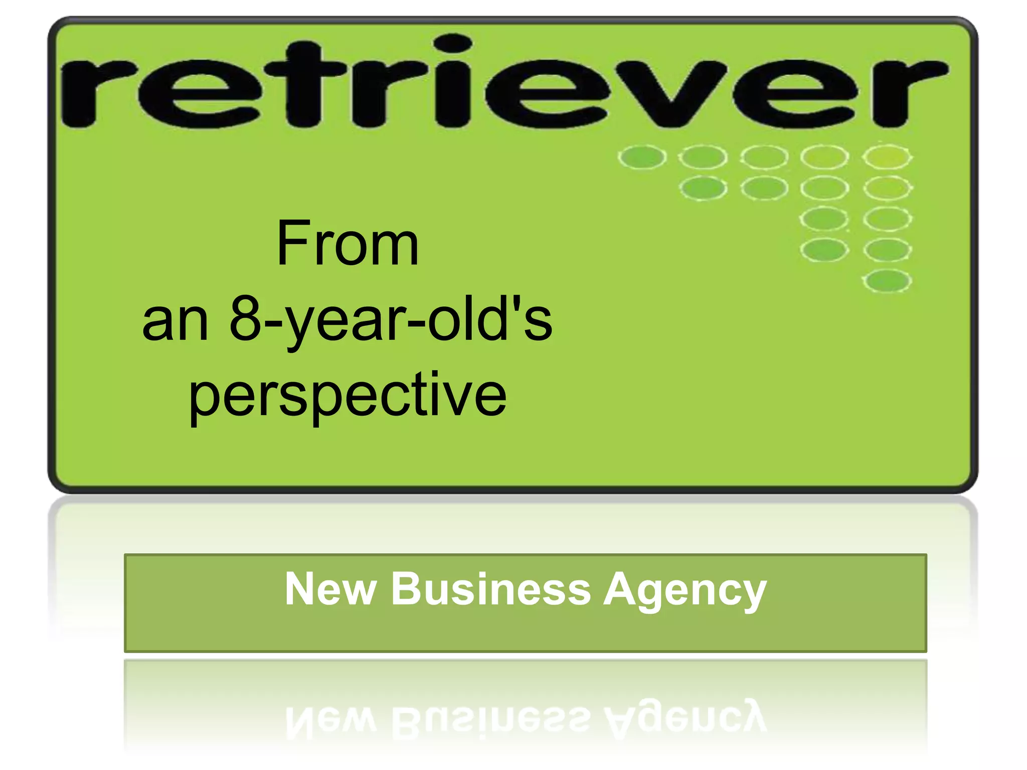 This document provides an overview of a new matchmaking business from the perspective of an 8-year-old. It introduces the business and its boss Mark Young, shows the team working hard and relaxing together, and features some of the team members and their mascot. The business helps many people and the team enjoys their work while also having fun.