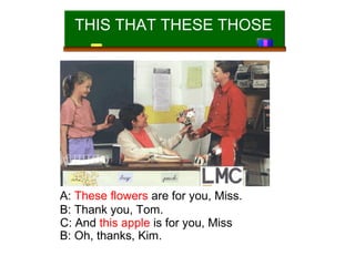 The document discusses the use of the words "this", "that", "these", and "those" to refer to objects based on their proximity. "This" and "these" are used for objects that are near the speaker, while "that" and "those" refer to objects that are farther away. Several examples are provided to illustrate the differences, such as referring to flowers as "these flowers" when holding them, compared to calling distant cows "those cows". The document also includes pictures labeling objects with the correct pronoun.