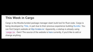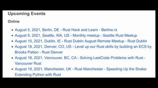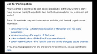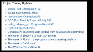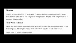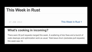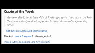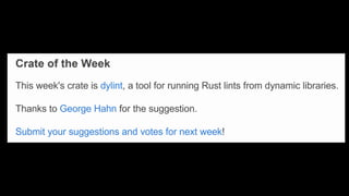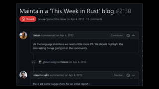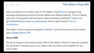 This Week in Rust is a community-driven project highlighting updates and contributions within the Rust programming community. The document emphasizes the dedication and inclusivity of Rustaceans, with insights into the importance of learning, open development, and public recognition of contributions. It also showcases personal experiences that highlight the supportive nature of the community.
