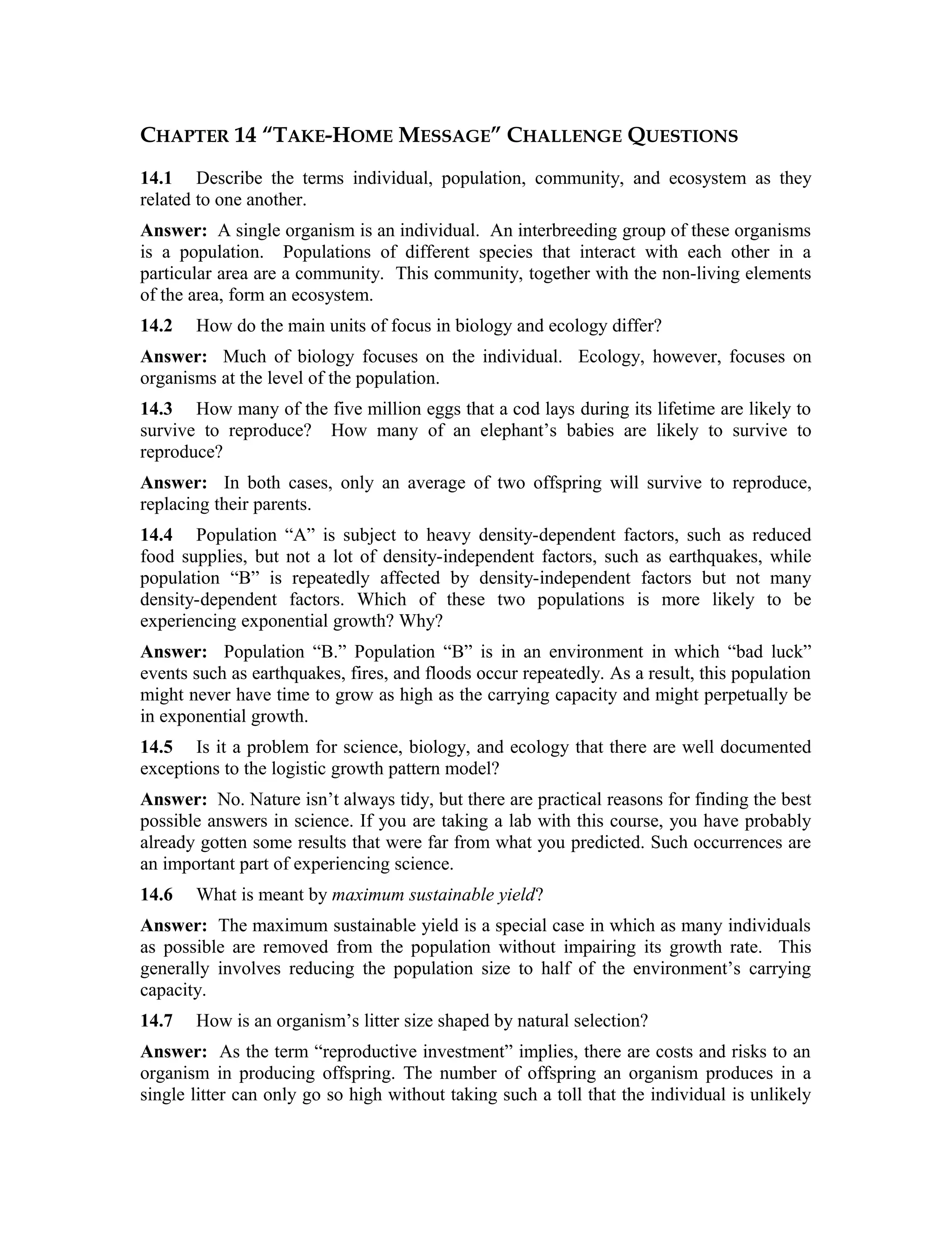 This document contains answers to 15 "take-home message" challenge questions about key concepts in biology and ecology. The questions cover topics like the relationship between individuals, populations, communities and ecosystems; how the units of focus differ between biology and ecology; population growth patterns; natural selection; survivorship curves; litter size; maximum sustainable yield; and human population growth and limits.